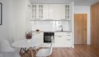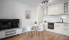 salon z aneksem kuchennym wyposażonym w płytę indukcyjną, piekarnik, zmywarkę i okap