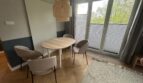 Salon z balkonem – wyposażony w rozkładaną skórzaną sofę, stół z krzesłami oraz pojemną szafę.
