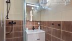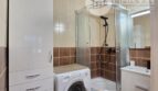 Łazienka – kabina prysznicowa, pralka, umywalka z szufladami, lustro, szafa.