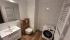 – Łazienka: pralka, biały montaż, płytki ceramiczne na podłodze i ścianach