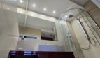Nowoczesna Kuchnia w pełnej zabudowie, na podłodze gres polerowany, na ścianach duże tafle luster.