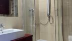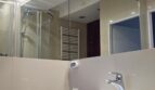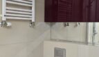 Duża łazienka z dwiema taflami luster, meble lakierowane wc podtynkowe, gres na ścianach i podłodze.