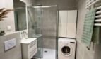 Łazienka (~4m2): prysznic, WC, umywalka z szafką, pralka, lustro, szafka