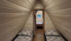 Układ pomieszczeń: na parterze salon z kuchnią oraz łazienka (oraz kominek), na piętrze dwie sypialnie – z jednej wyjście na balkon