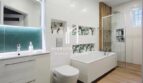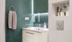 – komfortowa łazienka o powierzchni 8,72m2 wykończona w jasnych barwach z akcentem zielonego dekoru, doskonale zaaranżowana z miejscem na wannę, prysznic, WC i umywalkę,