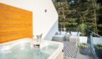 Każdy domek wyposażony został w jacuzzi na wyłączność dla Gości z jednego domku (jacuzzi renomowanej, amerykańskiej firmy, pionera w produkcji jacuzzi). Dodatkowo na terenie znajduje się fińska sauna, nowoczesna pergola, miejsce na ognisko, plac zabaw dla dzieci z błotną kuchnią, ogródki z hamakami.