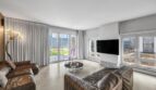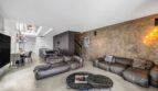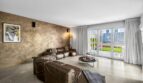 Salon z dużymi przeszkleniami, wyjściem na taras i ogród; marmur na podłodze.