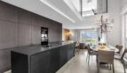 Kuchnia z wyspą, AGD Miele, blaty z kamienia, zabudowa z forniru dębowego.