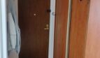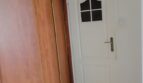 Przedpokój zabudowany szafami, solidne drzwi wejściowe.