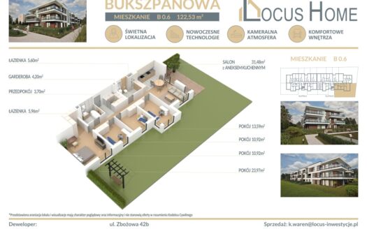Spółka LOCUS HOME to DEWELOPER który realizuje inwestycje mieszkaniowe na terenie Katowic od wielu lat. NOWA inwestycja na ulicy BUKSZPANOWEJ (obok nr 19) w Piotrowicach to nowoczesny apartamentowiec w doskonałej lokalizacji Katowic.