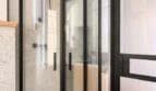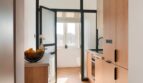 – do łazienki prowadzą drzwi osadzone na metalowo-szklanej ścianie wykonanej według naszego indywidualnego projektu na zamówienie. Szkło matowe, dwuwarstwowe, ryflowane,