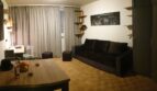 W dużym pokoju telewizor 65 cali, rozkładana sofa z możliwością spania, rozkładany stół jadalny dla 6 osób i 2 pufy oraz ława kawowa.